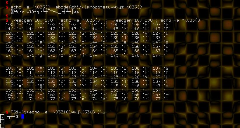 Using escape sequences in RXVT (also works in Xterm and RXVT derivatives like aterm, which is used here) to produce line draw characters. The "escgen" script used above is given earlier in the HOWTO.