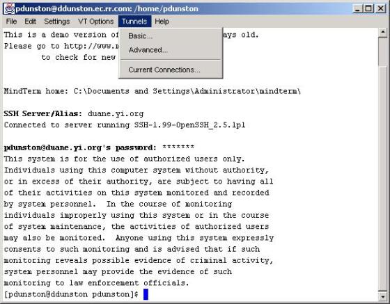 now save it with a .bat extension. Double-click on it. You should be prompted for your login name when MindTerm starts up then type your password. After you are authenticated click on the Tunnels menu and click Basic. You should see the tunnels in the box that opens up. This is an easy way to allow remote users to start up the tunnels without many configurations on their part. They only need to click the .bat file and type their username and password and optionally run vlock. Their client software can be pre-configured for remote profiles that connect to the tunnels automatically.
