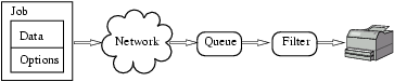 2. The spooling system copies the job and the options over the network in the general direction of the printer.