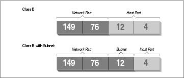 Figure 2-1 shows how 149.76.12.4, the address of quark, is interpreted differently when the address is taken as an ordinary class B network and when used with subnetting.
