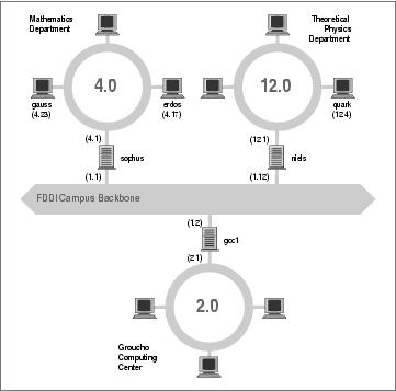 Figure 2-2 shows part of the network topology at Groucho Marx University (GMU). Hosts that are on two subnets at the same time are shown with both addresses.