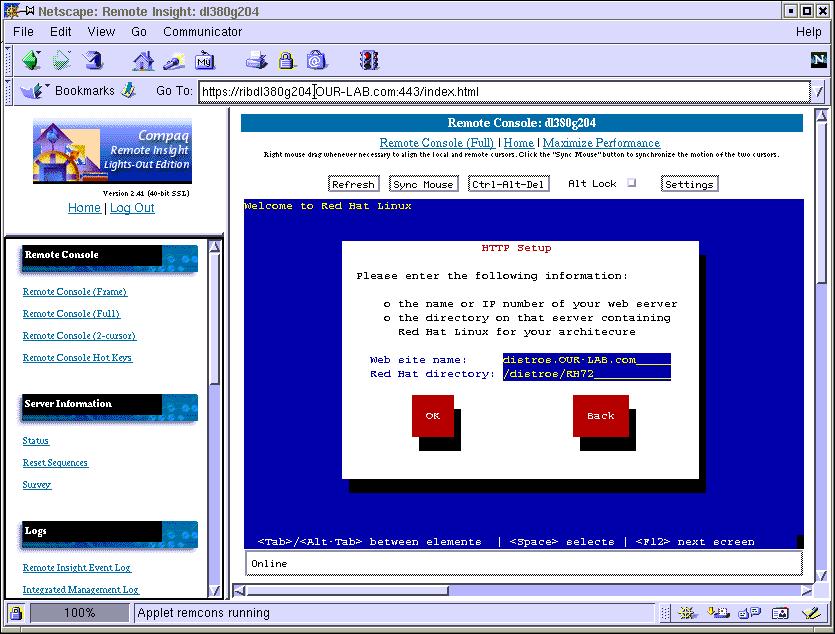 1. Connect to the Remote Insight Lights-Out card of the Linux system from a Java-enabled browser (Netscape, MSIE) using the URL https://XX.XX.XX.XX where the X's are the IP address assigned to the card. You can use a Linux system running Netscape or a Windows system running Netscape or Microsoft Internet Explorer. Just have the redhat-bootnet.img local to the system running the browser. Note that this special image file is larger than a regular 1.44MB floppy. Note: You may want to use FTP to move the file to the system that you will run the browser on.