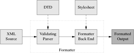 The part of the diagram inside the dotted box is your formatting software, or toolchain. Besides the obvious and visible input to the formatter (the document source) you'll need to keep the two `hidden' inputs of the formatter (DTD and stylesheet) in mind to understand what follows.
