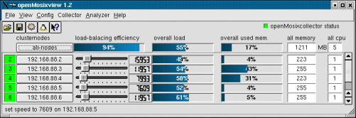 The progress bars in the middle gives an overview of the load on each cluster-member. It displays in percent so it does not represent exactly the load written to the file /proc/hpc/nodes/x/load (by openMosix), but it should give an overview.