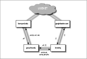 These articles are then exchanged between all Usenet sites that are willing to carry news from this group. When two sites agree to exchange news, they are free to exchange whatever newsgroups they like, and may even add their own local news hierarchies. For example, groucho.edu might have a news link to barnyard.edu, which is a major news feed, and several links to minor sites which it feeds news. Now Barnyard College might receive all Usenet groups, while GMU only wants to carry a few major hierarchies like sci, comp, or rec. Some of the downstream sites, say a UUCP site called brewhq, will want to carry even fewer groups, because they don't have the network or hardware resources. On the other hand, brewhq might want to receive newsgroups from the fj hierarchy, which GMU doesn't carry. It therefore maintains another link with gargleblaster.com, which carries all fj groups and feeds them to brewhq. The news flow is shown in Figure 20-1.